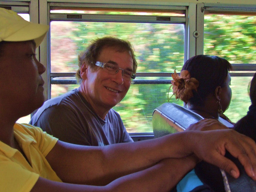 What he perceives as atmosphere in his discotheques and clubs like Zauberberg, Studio or Airport, he simply describes as overcrowding here in the ancient buses of Panama.