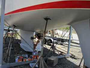 But this hurdle was also cleared and Odin entered the old, little-maintained Travel Lift. Creaking and squeaking, we moved towards the water, where a suddenly flat tire on the crane caused a stir.